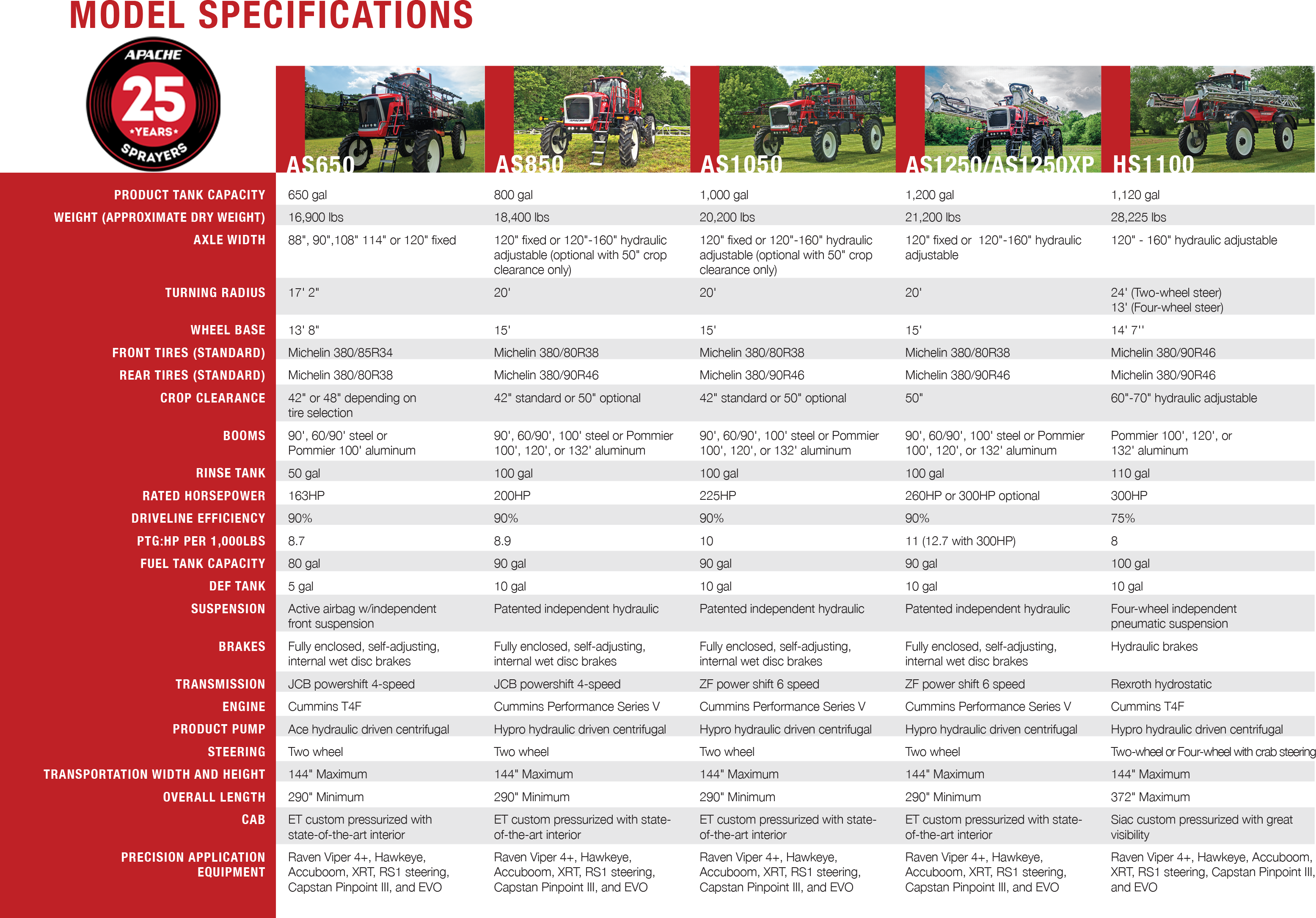 Apache Owners Manuals and Sprayer Specs are the go-to source for all information needed to operate, maintain and service your Apache Sprayer. Below, you can download Apache owner’s manuals, Model Information and Spec sheets to compare sprayer specifications for different Apache models. Or, you can also request a catalog by mail.